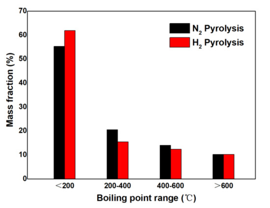 TG analysis can be used to estimate the boiling point range of pyrolysis bio-oil [23]. According to the TG analysis results, the boiling point range distribution of pyrolysis bio-oil is shown in Figure 5. The results show that the content of compounds with a boiling point of 0–200 °C in the pyrolysis bio-oil obtained in a hydrogenation atmosphere is 63.21%, while the content of compounds with a boiling point of 0–200 °C of pyrolysis bio-oil in a nitrogen atmosphere is 55.11%. Therefore, the low boiling point fraction of pyrolysis bio-oil can be increased in a hydrogen atmosphere, which is conducive to the fueling of pyrolysis bio-oil. The fraction range of gasoline is 30–220 °C. Therefore, pyrolysis bio-oil in the hydrogen atmosphere is conducive to the formation of low boiling point fractions.