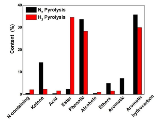 To systematically and comprehensively analyze the content changes in various substances in the two pyrolysis bio-oils, we further classified the components of pyrolysis bio-oils in different atmospheres. Compounds are divided into eight groups, including nitrogen compounds, esters, acids, hydrocarbons, ketones, phenols, furans, alcohols, and ethers. Hydrocarbons are subdivided into aromatic compounds and aromatics for an accurate analysis. If a compound can be divided into multiple categories, it was classified according to the following priority: phenol > aromatic compound > ester > acid > ketone > alcohol. The results are shown in Figure 7. The peak area cannot represent the exact amount of compounds. The peak area of aromatics in pyrolysis bio-oil under nitrogen atmosphere is the largest (35.76%). In pyrolysis bio-oil under hydrogen, the peak area of aromatics is 30.01%. In addition to the relatively weak oxygen bridge bond C-O-C, side-chain bonds are present on the monomer benzene ring in a large amount of lignin in the sample, and these bonds are easily broken by heating to form active benzene ring groups, which may form large macromolecules with other free radicals [24]. However, inhibiting the formation of active benzene ring groups in the hydrogen atmosphere is consistent with the reduction in aromatic compounds from 7.2% to 0% in the hydrogen atmosphere. It mainly inhibits the formation of active benzene ring groups. Acids, phenols, aldehydes, alcohols, ketones, and furans in pyrolysis gas undergo deoxylysis, oligomerization, hydrogen transfer, and other reactions in the hydrogen atmosphere, and these compounds are difficult to aromatize. In the hydrogen atmosphere, the phenols of pyrolysis bio-oil decreased by 15.6% from 33.66% to 28.38%. It also shows that aromatization is inhibited. Other types of oxygen-containing groups are present in the lignin structure in the sample, such as carbonyl and hydroxyl, which are decomposed into small molecular chemicals and remain in the side chain of the benzene ring. However, in the hydrogen atmosphere, the free radicals of hydrogen inhibit the binding of other groups and are not easy to bind to the side chain of the benzene ring.