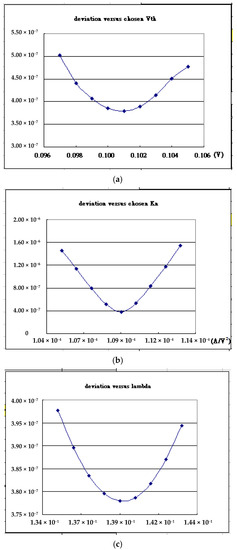Three parameters (Vth, Kn, lambda) at VG = 1.0 V on W120L240 (fin width = 120 nm, and channel length = 240 nm) are determined through minimum deviation technique with the minimum deviation = 3.79569 × 10−7 A at (a) Vth = 0.101 V as in deviation versus Vth, (b) kN = 1.09 × 10−4 A/V2 as in deviation verses kN, and (c) lambda = 0.139 as in deviation versus lambda.