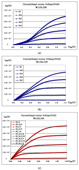 Therefore by using the same skill, all the parameters in Equations (1) and (2) are determined to fit the measured characteristic curves except the ones in Figure 2a,b. where the two transistors, denoted by W110L100 (Fin width = 110 nm, Channel length = 100 nm) and W110L120 (Fin width = 110 nm, Channel length = 120 nm), do not look like FET and are not worth fitting. All the other fitting results are shown in Figure 2c, Figure 3a–c and Figure 4a–c. The final minimum delta’s at various VG’s. range from 3.25 × 10−8 Ampere to 1.36 × 10−6 Ampere, which are engineering acceptable.