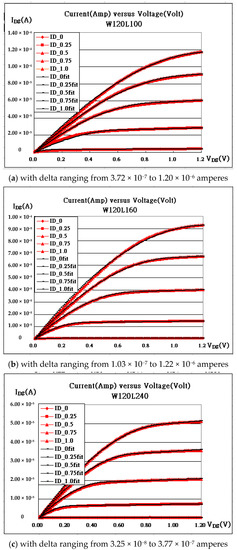 Equation (1) works as VDS is less than (VGS − Vth) while Equation (2) works as VDS is larger than (VGS − Vth). And those parameters are predominantly determined to minimize the deviation (delta, δ) as follows in Equation (3):