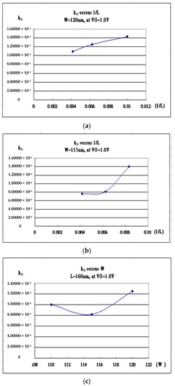 In addition, all determined kN’s may be specifically listed as in Table 1, Table 2 and Table 3 at different sizes and at different VG’s [12]. In the modified conventional formula in Equations (1) and (2), kN is supposed to be inversely proportional to the channel length. And kN is also proportional to the channel width (Wchannel) and, thus the width of the fin (Wfin), because Wchannel = (9 + 9 + 1) Wfin = 19Wfin. If kN is plotted against Wfin or 1/Lchannel, straight lines are then expected. Unfortunately, most of them fail the testing except on the devices with fin width = 120 nm at VG = 1.0 V partly as found in Figure 5. Of course, at VG = 0.0 V, the transistors, which are still on and may have pretty low threshold voltage or even negative one, are not discussed in this paper. So the applied voltages to Gates depleting the fin channels and making the devices less leaky draw much attention. In Figure 4a, the straight line proves the feasibility at VG = 1.0 V with fin width = 120 nm, while the other two graphs, Figure 4b,c do not. The non-straight lines might be due to either over-depletion or under-depletion. Over-depletion means that the depletion regions from both sides of the fin overlap resulting to disturbing the blocking function. On the other hand, the depletion regions do not completely cover all the fin for under-depletion and the leakage current gets apparent.
