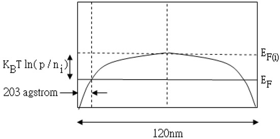 The three transistors with 120 nm fin width at VG = 1.0 V provide valuable information, i.e., the whole fin may be totally depleted without interference from the other side of the applied bias. One or the other side of the applied Gate bias depleted 60 nm, which is a half of the fin width, as shown in Figure 6, where the energy band appears with 1.12 eV energy gap. The so-called p-type channel or substrate is interpreted as boron dopants-in the silicon lowering the Fermi energy. Once the applied Gate bias bents the intrinsic Fermi energy down below the Fermi energy, the region becomes strongly inversed to n-type semi-conductor making the channel conductive. The thickness of the conductive layer may as well be calculated by solving Maxwell’s Equations as stated in Equations (4) and (5) with W set to 60 nm. The channel concentration is then estimated to be p = 3.66 × 1023 (m−3), which is substituted into (KBT) ln(p/ni) to obtain 0.438 eV (energy difference between EF(i) and EF). Therefore, the strong inversion layer is determined to be 203 angstroms, which was one half of the parabolic curve (in Equation (4)) in Figure 6, and is surprisingly about one third of the whole fin width.