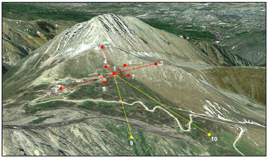 Disposition of the HORIZON-T detector points over the mountain pass of the Tien Shan station: an aerial view and a graph scheme.