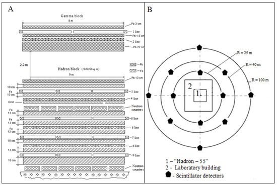 Upgraded ionization calorimeter with a field of scintillation detectors. (A) Installation Hadron-55; (B) infrastructure.