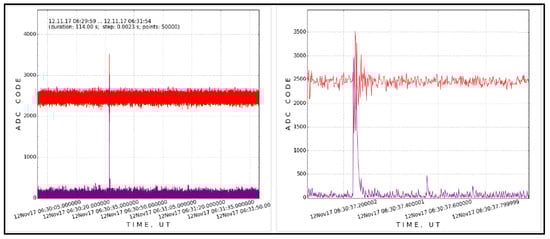 Visualization of the recording of signals from an acoustic detector in the graphic window of the application program. The top graph in the left figure is the microphone signal, the lower graph is the low-frequency envelope. In the right figure, the time domain around the short-term burst of intensity observed in the acoustic signal is stretched along the horizontal axis.