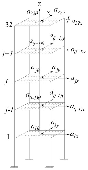 Layout of the translation and rotation accelerometers on different floors: X axis; Y axis; Z rotation axis.