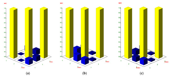 Correlation verification of modes at the first three orders along the X axis, Y axis and torsional direction: (a) correlation verification of modes at the first three orders along the X axis; (b) correlation verification of modes at the first three orders along the Y axis; (c) correlation verification of modes at the first three orders along the torsional direction.