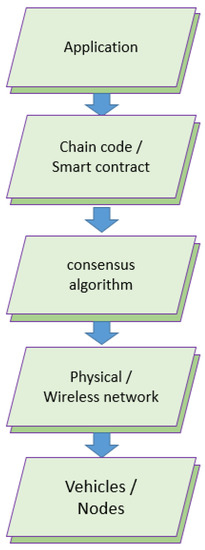 The proposed scheme uses the Fabric Certificate Authority (CA) for the registration of identities. It has sufficient capabilities, such as high computation, fast communication, and enough storage. CA is also responsible for the generation of certificates for vehicles and roadside units. Additionally, once their registration is complete, the TA produces the initial security parameters for all vehicles and roadside units (RSUs), and sends them to the vehicles via TLS. Issuance of Enrollment Certificates (ECerts) is an enrollment process whereby the Fabric CA issues a certificate key-pair, comprised of a signing certificate and a private key that forms the identity [25]. The private and public keys are first generated locally by the Fabric CA client, and then the public key is sent to the CA, which returns an encoded certificate, the signing certificate for certificate renewal, and revocation. Orderers are stationary nodes deployed on the roadside. These orderers act as the RSUs. The orderer maintains the list of the organizations that can create and configure the channel, and are responsible for ordering and packaging the transactions. The orderer also obtains the certificates that represent identities, and the Membership Service Provider (MSP) contains the permission identities. The orderer utilizes a dedicated short-range communication protocol for V2V and V2R wireless communications. The MSP authenticates traffic messages from vehicles and processes them locally or forwards them to the TA. The law enforcement department may request the CA to revoke the real identity of the message sender if malicious activity is detected. Vehicle nodes are embedded with high processing, storage, and wireless communication modules. The vehicle-to-vehicle and vehicle-to-RSU communications are conducted through wireless networks. Figure 1 shows the layers of the proposed solution.