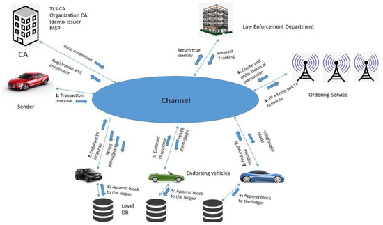 In the next phase, the sender verifies the signatures of all endorsing vehicles and ensures that the proposal responses from all the vehicles are the same. It verifies that the specified endorsement rules are achieved before submission. If the sender does not inspect responses and forwards messages without endorsement, then the endorsement rules are still imposed by other vehicles in the channel and upheld at the “commit validation phase”. After verifying the responses and updating the ledger, it sends a message to the RSU (ordering service). The message proposal and endorsing reply are then bundled into a message and sent to the RSU by VA. The OS does not need to search the whole content of the message; however, it simply orders all of the transactions received from the channels, and generates blocks of transactions for each channel. In the next phase, the transaction blocks are delivered by OS to all vehicles on that channel. The endorsement rules are verified by validating the message within the block. The block’s transactions are classified as “valid” or “invalid”. Each vehicle adds the block to the channel’s chain and, if the transactions are valid, then write sets are committed to Level DB. Each vehicle notifies VA that the message has been added to the chain, and whether the message was validated. Figure 2 shows the flow diagram of the enhanced Fabric.