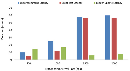 Figure 4 shows the different latencies of transactions, such as endorsement latency, broadcast latency, and ledger update Latency. We note that latency increases with the increase in the number of transactions per second.