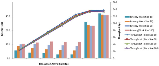 Figure 5 shows the number of transactions per second, which is known as transaction throughput. The time it takes for a transaction to commit is known as transaction latency. The throughput increases linearly as the transaction arrival rate rises. The throughput becomes saturated at roughly 140 tps, and the latency rapidly increases. The latency will be the same for all block sizes. A smaller block size is faster when the transaction rate rises before the saturation point