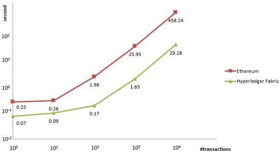Any system must grow with the growth of the users. This requires more computational power. The system must handle short spikes and short periods of high demand. If the system is unable to respond in a sensible time, transaction flow will be affected and delayed. Hyperledger Fabric is scalable, and comprises a channel system enabling new channels to be created without disturbing the previous architecture. New nodes can be added and deleted without causing any disturbance to the existing environment. Figure 4 shows the latency in the enhanced Fabric transactions. Latency refers to block time, which is the time required to generate the next block of the transaction. Latency is the amount of time a user has to wait for its transaction to be validated and included on the blockchain.