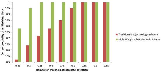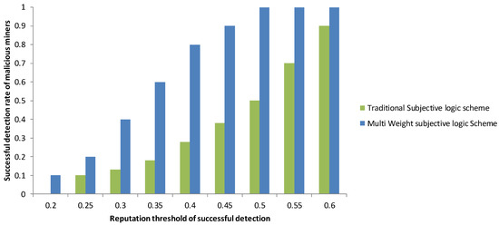 We used the traditional subjective logic scheme and the proposed BESA solution based on the multi-weight subjective logic scheme to track the detection rate of 10 malicious miner candidates for 1 h. The MWSL technique had a substantially greater successful detection rate of malicious miners than the TSL scheme. We note that when we set the value of the reputation threshold to 0.5, the proposed scheme has a detection rate that is approximately 99 percent higher than that of the traditional subjective logic scheme. Because the MWSL scheme has a greater detection rate, possible security threats can be discovered and prevented more effectively, resulting in a more secure blockchain-enabled IoV.