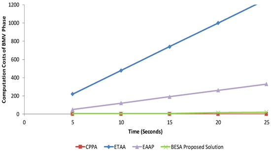 We calculated the computation cost of the proposed BESA scheme with state-of-the-art schemes to evaluate the scheme overrun of a real-time processor. Computational cost is the execution time per time step during simulation. To estimate this time, we executed the scheme in a simulation, and measured the execution time and determined the average execution time per time step on a real-time target. It is clearly shown in Figure 9 that the computation cost of message verification of the proposed solution is lower than that of the existing schemes of CPPA [8], ATAAP [22], and EAAP [9]. Figure 10 shows the comparison of BESA communication cost with that of existing schemes.