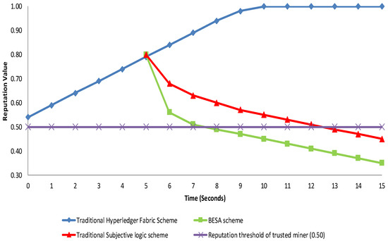 Figure 11 depicts the reputation of a malicious miner candidate as seen through the eyes of a well-behaved vehicle in three scenarios: the traditional Hyperledger Fabric scheme, the traditional subjective logic scheme, and our BESA scheme. In the standard Hyperledger Fabric scheme, because there is no reputation element, vehicles are unable to identify the malicious vehicles, and thus the vehicle’s evaluation of malicious candidates increases. The traditional subjective logic scheme and our BESA scheme are both based on the reputation values of vehicles; thus, we note that opinions from other well-behaved vehicles decrease the reputation of malicious vehicles in both schemes. Reputation values are below the reputation value of 0.50. It is also clear that the MWSL is more efficient because it is based on different weights. As result, our BESA scheme has a more precise reputation calculation than the TSL, which leads to a more secure leader selection process.