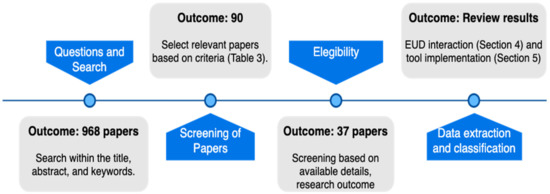 We divided the inclusion/exclusion criteria into three phases of relevant literature for the review (Table 3). In the first phase, we queried research databases obtaining 968 documents. We then obtained 492, discarding papers mainly because they are duplicate, inaccessible (due to license restrictions), or unrelated to the subject. In the second phase, we screened in detail the papers, primarily based on the available details. The major criteria are comprehension aspects related to UI building techniques (based on EUP, EUD, EUSE). After the second phase, we obtained 90 for an in-depth reading. In the third phase, we selected 37 papers for the review, based on the following considerations: