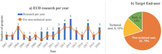 Table 4 lists the analyzed papers by year, summarizing the programming interaction and composition metaphor. The reviewed papers target two categories of end-users: technical end-users (i.e., users with some knowledge of software) and non-technical users. Figure 2 shows the distribution of research over time, with 26 out of 37 papers targeting EUD only for non-technical users. The papers presented implementations for a diversity of context, development, and running environments (Table 5).