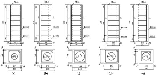 Two types of steel were used in the test: rebar and steel tube. The stirrup was Φ6 HRB400 steel reinforcement bar. The stirrup spacing in the unencrypted area located within 400 mm in the middle of the column was 80 mm, and the other area was 30 mm. Longitudinal rebars were 4Φ12 HRB400 steel reinforcements located at four corners. The steel tubes were strength grade Q235B straight-welded circular steel tubes. There were 5 types of reinforcement for all specimen sections, as shown in Figure 2.