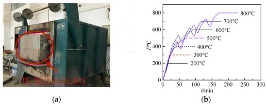 After curing, all specimens (the concrete standard samples, the steel standard samples, and the column specimens) were exposed to high temperature using an RX3-45-9 industrial box resistance furnace at the State Key Laboratory of Engineering Disaster Prevention and Structural Safety, Guangxi University (China). The heating device and measured temperature rise curves are shown in Figure 3. First, all specimens were heated to the design temperature, which was kept constant for 60 min. Then, the test specimens were taken out and cooled naturally to ambient temperature (20 °C).