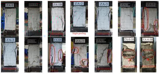 When the heating temperature T < 500 °C, the concrete cover did not completely peel off until failure, the vertical and oblique cracks staggered to form the main cracks, and the edge concrete collapsed and failed without longitudinal reinforcement bulking or stirrup deformation. When T ≥ 500 °C, the concrete cover was badly damaged and could not contribute to the ultimate bearing capacity of the specimen. At the same time, the damage to the outer concrete was serious, and the loading was mostly borne by the CFST with excellent deformation capacity, resulting in a large ultimate displacement until failure. The outer concrete was seriously peeled off, some stirrup bars were exposed and deformed, and the longitudinal reinforcements buckled.