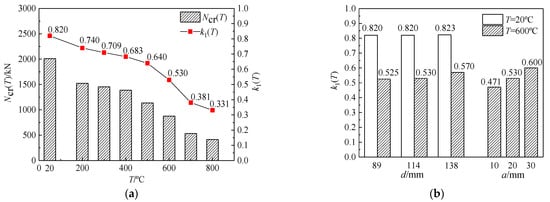 Figure 7b reflects that the diameter of the steel tube had no significant influence on the k1(T)-value at ambient temperature, which was stable at about 82%. At high temperature (T = 600 °C), the k1(T)-value uniformly increased with increases in steel tube diameter and concrete cover thickness, but the increase was small with the increase in steel tube diameter.