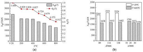 Figure 8b reflects the influence of steel tube diameter (d) on the ultimate bearing capacity of the specimens. It can be seen that under both ambient temperature and high temperature (T = 600 °C), the ultimate bearing capacity increased with the increase in steel tube diameter. Compared with specimens with d = 89 mm, the ultimate bearing capacity of the specimens with d = 114 mm and 138 mm increased by 4.68% and 7.82%, respectively at ambient temperature, while it rose by 1.54% and 3.32%, respectively, under exposure to high temperature (T = 600 °C).