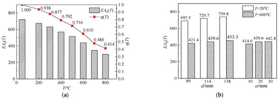 Change laws of deformation coefficient of specimens. (a) Influence of T. (b) Influence of d and a.