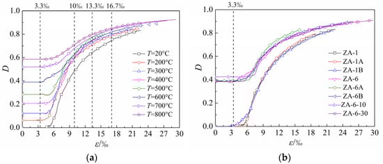 It can also be seen from Figure 11 that the damage evolution curves of the specimens were not significantly affected by the diameter of the steel tube or the thickness of the concrete cover, and far less so than by the heating temperature. The higher the heating temperature was, the more serious the initial damage to the specimen was. Before the average longitudinal strain reached 3.3‰, the damage evolution curve of the specimen was in the horizontal and linear segment, and the damage accumulation was very small. Subsequently, the rapidly ascending section of the curve became shorter with increased heating temperature. The failure strain corresponding to 85% Nu(T) of the specimens at T ≤ 500 °C varied between 13.3‰ and 16.7‰, while it was between 10.0‰ and 13.3‰ when T ≥ 600 °C. Finally, only the curves of specimens at T ≥ 600 °C could enter the stationary segment, and the deformation at the end of loading was relatively larger.