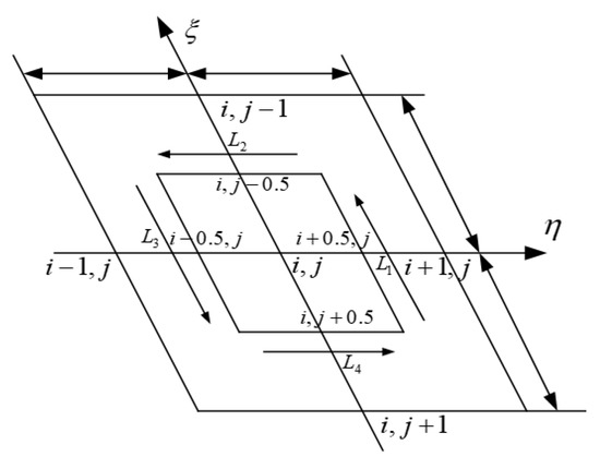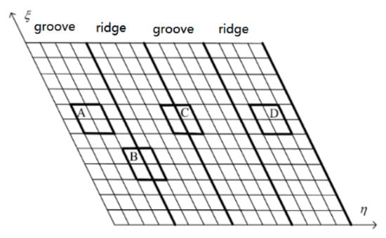 When dividing the mesh, the mesh boundary should coincide with the bearing ridge and groove boundary, so that the calculation accuracy is higher, and so the mesh shape is a parallelogram. Figure 3 shows that there are positions where the film thickness has a step change, which is difficult to calculate. At the same time, there is a cross partial derivative term in the equation where the film thickness is continuous, so the previous five-point difference method is no longer applicable. In this paper, the local integration method is used to study the continuous area of the oil film thickness and the step change of the oil film thickness to explain the principle of solving the equation.