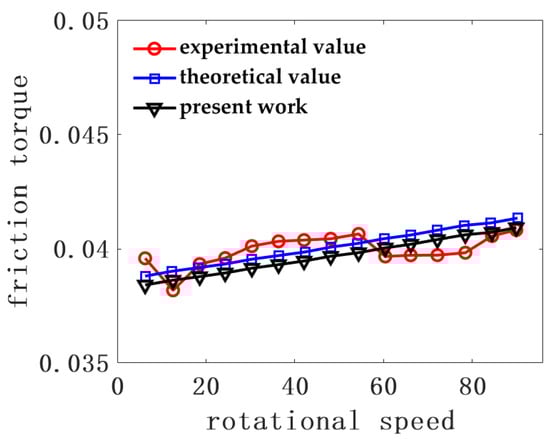 At the same time, we used the parameters of the herringbone groove journal bearing in the reference to calculate the friction torque of the bearing and compared it with the experimental and theoretical results in the reference [40] to verify the correctness of the calculation model in this paper. The comparison diagram is shown in Figure 9.
