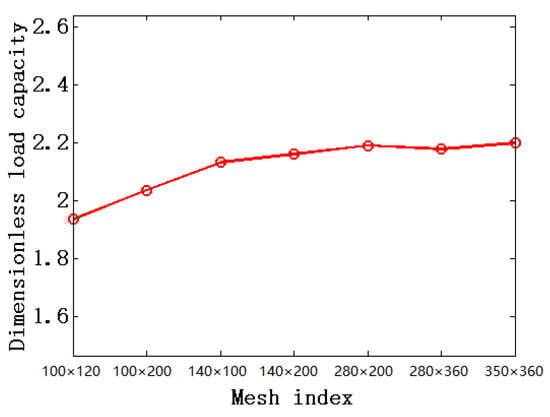 When using the finite difference method to solve the bearing performance, the mesh density is the key to ensuring the accuracy of the calculation results. In order to determine the reasonable number of grids, a variety of differential grid numbers were used to calculate the bearing capacity of the herringbone groove journal bearing. The results can be seen in the Figure 10. Finally, the reasonable number of grids is determined to be 280 × 200, and the calculation result is not much different from 350 × 360.