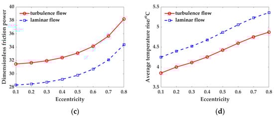 Figure 11 shows the comparison of the turbulence flow model and the laminar flow model. After considering the turbulence flow state, the fluid molecules move violently. Compared with the laminar flow model, the bearing load capacity, side leakage, and friction power become larger, and the average temperature rise becomes smaller.