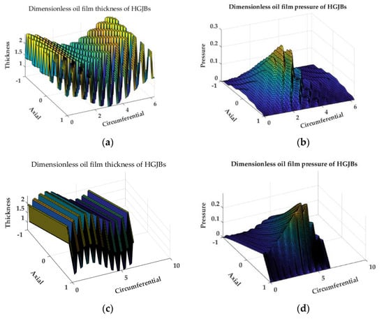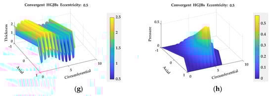 Figure 13 shows the oil film thickness diagram and pressure distribution diagram of the constant-width HGJBs and the newly designed convergent HGJBs calculated using the oblique coordinate system when the eccentricity is 0.3 and 0.5, where Figure 13a,b,e,f are the calculation results of the constant-width HGJBs, and Figure 13c,d,g,h are the calculation results of the convergent HGJBs.