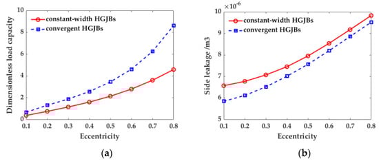 With the increase of eccentricity, the minimum oil film thickness decreases, and the pressure gradient increases, which leads to an increase in bearing side leakage. The friction power increases with the increase of eccentricity, so that the average temperature rise of the bearing also increases. Compared with the constant-width HGJBs, the groove shape of the convergent HGJBs is in a convergent state, resulting in a smaller herringbone groove area and a smaller overall oil film thickness. Therefore, its lubricating oil reserve is less, resulting in convergent HGJBs having smaller side leakage and greater friction power resistance. When the eccentricity is 0.5, the side leakage is 4.83% smaller than that of the constant-width HGJBs, which causes the average temperature rise to increase. But it can be seen from the Figure 11 that there is not much difference between the side leakage and the average temperature rise between the both.