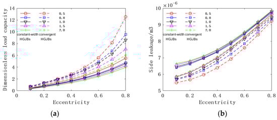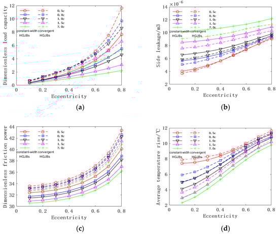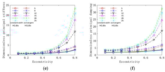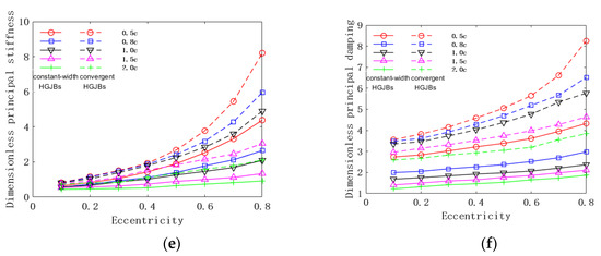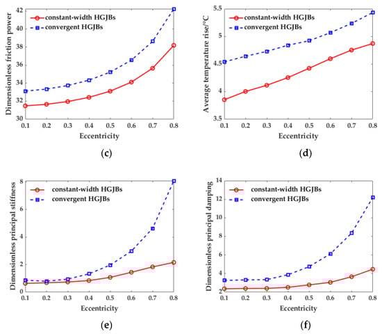 We kept other parameters unchanged, changed the eccentricity from 0.1 to 0.8, and analyzed the changes in the static and dynamic performance of the convergent HGJBs and constant-width HGJBs, as shown in Figure 14.