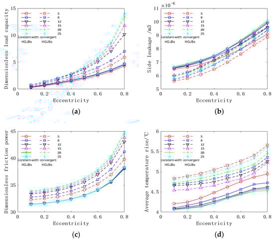 Figure 18 shows that as the groove depth increases, the bearing load capacity shows a gradual decreasing trend; the side leakage increases, and the friction power decreases slowly with the increase of the groove depth. The temperature rise gradually decreases and stabilizes. When the groove depth is 0, the HGJBs becomes an ordinary journal bearing at the moment, so the bearing load capacity will reach the maximum. On the one hand, by increasing the groove depth, the existence of the groove will destroy the continuity of the bearing oil film pressure; on the other hand, as the groove depth increases, it will cause the generation of cavities, resulting in a decrease in the bearing load capacity. When the eccentricity is 0.5, the maximum bearing load capacity of the convergent HGJBs is 26.43% larger than the minimum bearing load capacity, and the maximum friction power is 3.06% larger than the minimum friction power. The maximum bearing load capacity of constant-width HGJBs is nearly twice as large as the minimum bearing load capacity, and the maximum friction power is 6.8% larger than the minimum friction power. The depth of the groove has a significant effect on the bearing load capacity but not on the friction power.