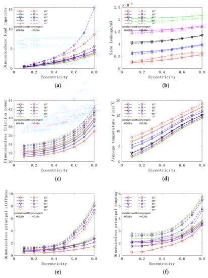Figure 16 shows that as the helix angle increases, the bearing load capacity of the bearing gradually increases to the maximum value and then decreases rapidly at a faster rate. It shows that as the helix angle gradually increases, the pumping effect of the bearing increases, so the bearing load capacity gradually increases. When it is increased to a certain range, the pumping effect is the best, and then the bearing load capacity gradually decreases. The Figure 16 shows that the helix angle has a more obvious influence on the bearing load capacity of the convergent HGJBs than that of the constant-width HGJBs. When the helix angle is 30°, the pumping effect of the convergent HGJBs reaches its best result, which is nearly twice the bearing load capacity corresponding to the helix angle of 45° when the eccentricity is 0.7. Similarly, when the helix angle is 30°, the bearing load capacity of the constant-width HGJBs is the largest, and when the eccentricity is 0.5, it is only half of the maximum bearing load capacity of the convergent HGJBs. The side leakage increases with the increase of the helix angle of the HGJBs. When the helix angle is 75°, the corresponding side leakage of the convergent HGJBs is nearly five times that when the helix angle is 15°. As the helix angle increases, the friction power of the convergent HGJBs also increases, but the amount of change is not obvious, and the increase is not large. Due to the increase of the side leakage, the helix angle increases, and the temperature rise decreases. When the helix angle increases from 15° to 75°, the average temperature rise drops significantly, overall, about 5 °C.