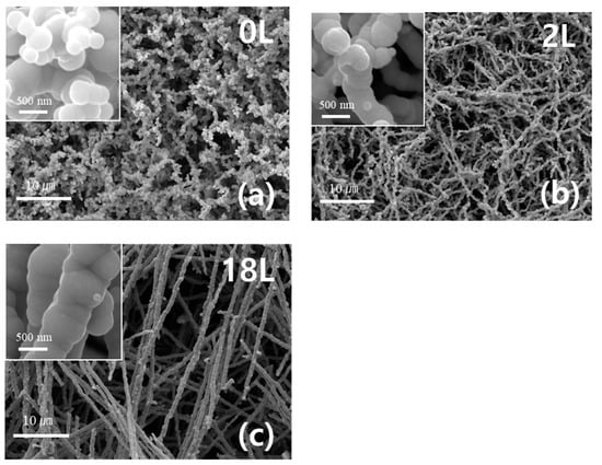 The difference in the composition and structure of the nickel phosphides according to the magnetic field strength was analyzed (Samples 0L, 2L, 18L in Table 1). Figure 1a–c show the electron micrographs of nickel phosphides obtained at magnetic fields of 0, 2, and 18 mT, respectively (hereafter, each specimen is denoted as sample 0L, sample 2L, or sample 18L, where the numbers represent the magnetic field strength and the letter L indicates a low phosphorus content). In the absence of a magnetic field, the agglomeration between particles was very irregular, and the overall structure was severely bent (sample 0L, Figure 1a). However, when a magnetic field was applied, the irregular and curved growth pattern changed to a one-dimensional growth pattern, even with a relatively low magnetic field (sample 2L, Figure 1b). Nanowires with highly uniform diameters and high aspect ratios grew under a high magnetic field (sample 18L, Figure 1c). It is considered that the wire growth of nickel phosphides in a magnetic field occurs due to the ferromagnetic properties of nickel. Nickel phosphide nanoparticles containing a large amount of nickel are arranged in a line along the magnetic flux under a magnetic field and combine to grow into nanowires. Because of the natural convection effect of the solution during synthesis, the stronger the magnetic field, the better the definition of the nanowire formed; this is consistent with previous literatures on the synthesis of pure nickel nanowires in a magnetic field [21,22].