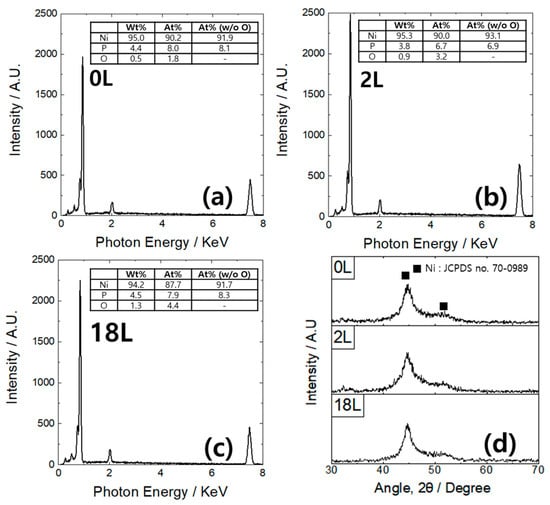 Figure 2a–c show the composition analysis results for samples 0L, 2L, and 18L, respectively. The phosphorus content in the three specimens was approximately 7–8% when the effect of oxygen resulting from surface oxidation caused by atmospheric exposure of the specimen after synthesis was eliminated. This implies that the magnetic field has virtually no effect on the composition. In addition, only broad peaks arising from the presence of Ni appear in the X-ray diffraction pattern, suggesting that the synthesized nickel phosphides are amorphous or low-crystalline materials. It is known that when the phosphorus content is relatively low, the crystallinity of nickel phosphides is sensitive to the phosphorus content. According to literature on the synthesis of nickel phosphides by electroless plating [25,26], nickel phosphides are crystalline when the phosphorus content is very low, but they become increasingly amorphous as the phosphorus content is increased. When the phosphorus content is 10 wt% or more, they are completely amorphous. Thus, the composition and structure analysis results for the nickel phosphides synthesized in this study are consistent with those in existing literature.
