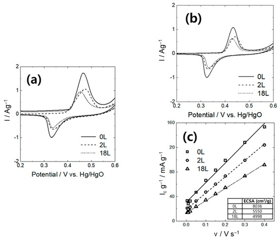 First, we attempted to investigate the effect of the reaction area in a situation where the phosphorus content in the nickel phosphide nanowire was fixed. To this end, the characteristics of electrodes constructed with nickel phosphide nanowires (samples 0L, 2L, and 18L; 7~8 at% P (Figure 2)) obtained under various magnetic fields were analyzed. Figure 4a,b show the cyclic voltammograms in the first and the second cycles. Figure 4c presents a charging current vs. scan rate plot and the ECSA values determined based on the plot (the table inserted in the figure). The presence of the irreversible anodic reaction (Equation (5)) was confirmed by the comparison of the first and the second cyclic voltammograms: Anodic current during the first cycle (Figure 4a) was much larger than that during the second cycle (Figure 4b) throughout the entire potential range, while the cathodic current values during the first and the second cycles are almost the same, strongly indicative of the irreversible anodic process in the first cycle.