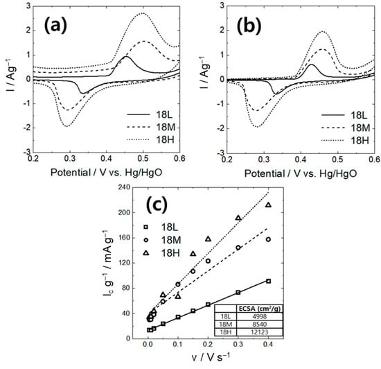 Next, the characteristics of electrodes fabricated using three nanowire specimens having different phosphorus contents (samples 18L, 18M, and 18H) were compared to investigate the effect of the phosphorus content in the nickel phosphide nanowires. Figure 5a,b show the cyclic voltammograms in the first and the second cycles. Figure 5c presents a charging current vs. scan rate plot and the ECSA values determined based on the plot (the table inserted in the figure). The amounts of reaction charge were increased in the increasing order of the phosphorus content in the nickel phosphide in the cyclic voltammograms (Figure 5a,b). Based on the quantitative analysis of the reversible cyclic voltammograms (Figure 5b), the charge amounts transferred during cathodic reaction of samples 18L, 18M, and 18H were determined to be 19.4, 52.6, and 95.9 C/g, respectively (i.e., the charge amount ratio is 18L:18M:18H = 1:2.47:4.94). In addition, the ECSA values determined based on Figure 5c were 4998, 8540, and 12,123 cm2/g, respectively, and the ratio was 1:1.71:2.43, which is significantly different from the charge amount ratio obtained from the cyclic voltammograms. This implies that the charge amount is affected by other factors, apart from the surface area effect. Remarkably, the ratio after simple mathematical correction of the area effect is calculated to be 1:1.44:2.03, which is almost similar to the phosphorus content ratio of the specimen (7.7:10.6:14.3 = 1:1.37:1.85 in Figure 3c). These results suggest that the phosphorus content and the surface area are two main governing factors affecting the reaction charge amount.