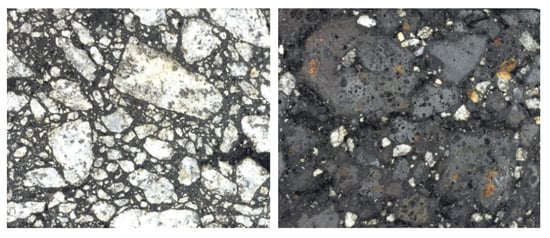 Examples of a conventional mixture (AC 20) with natural granitic aggregates and the corresponding asphalt mixture with 75% SSA can be observed in Figure 2. The images were taken after production, compaction, and sawing of the specimens.