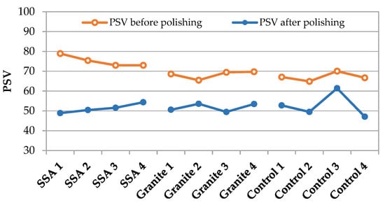 The test used to evaluate the resistance of aggregates to polishing was carried out on three aggregate groups of different origins: SSA, natural granitic, and control aggregates. Figure 3 shows the polishing stone values (PSV) measured in the British pendulum friction tester before and after polishing.