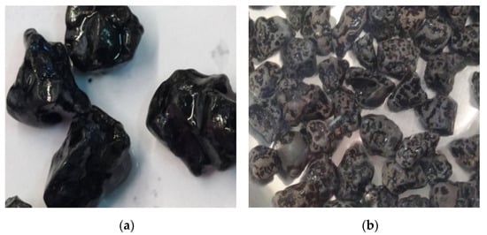 Examples of SSA aggregates surface covered with bitumen: (a) at the beginning of the affinity test; (b) after 24 h of exposure to test conditions.