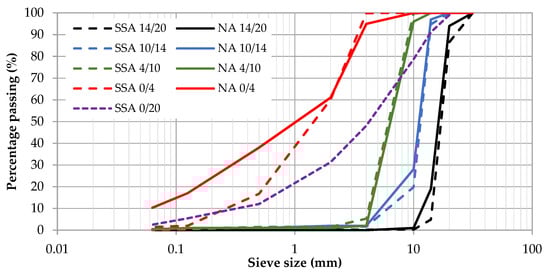 The particle size distribution of the different aggregate fractions, both for the SSA (0/4, 4/10, 10/14 and 0/20) and the natural aggregates (0/4, 4/10, 10/14 and 14/20), was determined using the EN 933-1 standard to assist the design of asphalt mixtures in complying with the specifications [26].