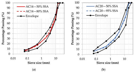 Grading curve adjustments for the asphalt mixtures with different SSA incorporation rates: (a) AC 14; (b) AC20.