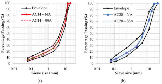 Grading curve adjustments for the conventional asphalt mixtures with natural aggregates (NA) and the selected asphalt mixture with 75% SSA: (a) AC 14; (b) AC 20.