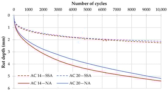 Rut depths of AC 14 mixtures after the WTT test: (a) natural aggregates; (b) SSA.