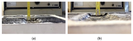 The results obtained demonstrate that the mixtures with SSA are much less susceptible to deformation than the equivalent conventional mixtures. Both asphalt mixtures with SSA have wheel tracking slopes (WTSAIR) lower than 0.1 mm/103 cycles, less than half of the identical asphalt mixtures with NA. The irregular and rough shape of the SSA may have contributed to this excellent performance at higher temperatures. Figure 9 shows images of the rut depth obtained in the AC 14 mixtures to exemplify the differences between the studied asphalt mixtures (100% natural aggregates and 75% SSA).